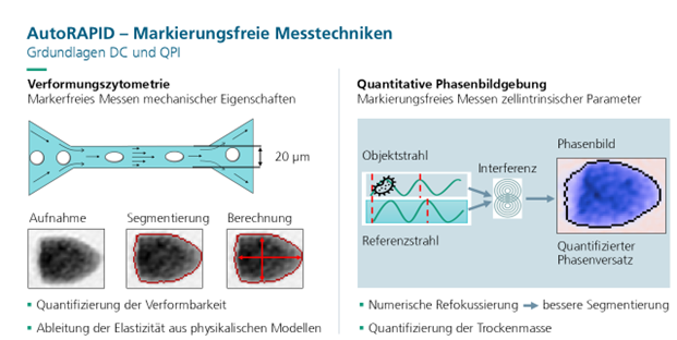 In der Zellforschung dominieren Hightech, Komplexität und lange Wege von der Idee zur Anwendung. Doch was passiert, wenn wir die Hürden senken und eine benutzerfreundliche Lösung für die markerfreie Einzellenanalyse entwickeln? Das AutoRAPID-Projekt des Fraunhofer IPA in Mannheim antwortet darauf mit einer vollautomatischen Plattform. Herz des Gerätes bilden ein mikrofluidischer Chip zur Verformungsanalyse (engl. Deformability Cytometry, DC) und eine Optik zur quantitiative Phasenbildgebung (QPI), um Biophysikalische Eigenschaften einzelner Zellen mit hoher Durchsatzrate zu bestimmen – ganz ohne Marker. In Zukunft soll die Plattform um weitere markenfreie Messmodalitäten erweiterbar sein, abgestimmt auf die Bedürfnisse der Anwender.