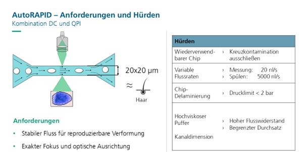 Warum ist das wichtig? Methoden wie DC und QPI ermöglichen eine schnelle Erhebung von Zellmerkmalen, ohne dass eine gezielte Markierung mit Antikörpern o. Ä. nötig sind. Das spart nicht nur Zeit und Geld, sondern reduziert experimentelle Variablen und erleichtert groß angelegte Studien. AutoRAPID geht noch einen Schritt weiter. Die Grundlagen dieser Technologien werden in einem System vereint, welches nur minimalen Benutzereingriff erfordert. Die Plattform setzt auf eine robuste Mikrofluidik, präzise optische Ausrichtung, sensorbasierte Prozesssteuerung, eine benutzerfreundliche Oberfläche und vor Allem die Möglichkeit das System um verschiedene markerfreie Messmethoden je nach Anforderungen der Nutzer zu erweitern. Ziel ist es, die Einstiegshürde zu senken und die Verlässlichkeit der Messungen zu erhöhen, damit Forscherinnen und Forscher sich stärker auf die biologischen Fragen konzentrieren können statt auf die Technik.